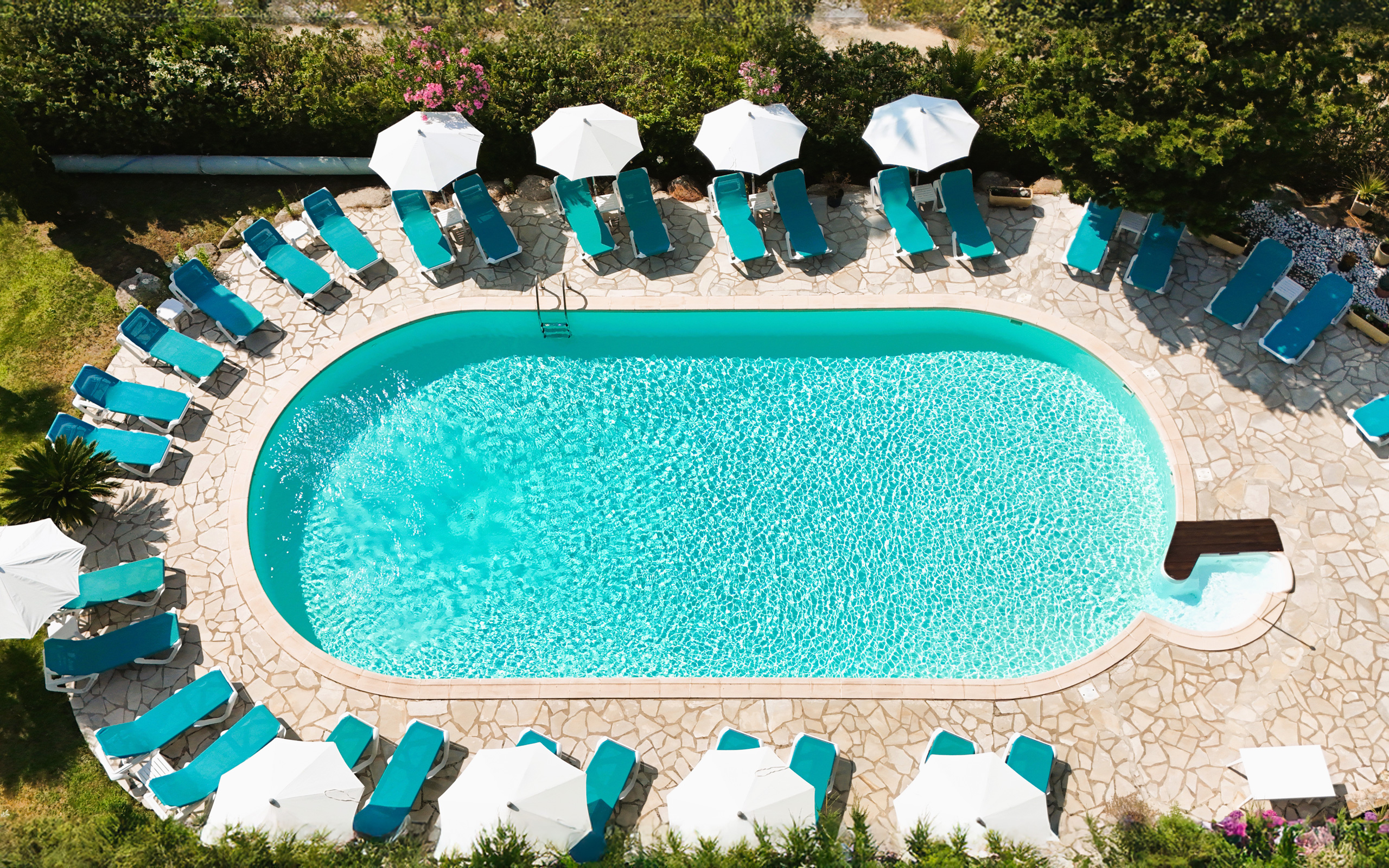 Le grand espace de chaque location permet relaxe et discrétion. Au centre du parc très fleuri se trouve une très jolie piscine avec Balnéo, agrémentée de fauteuils.